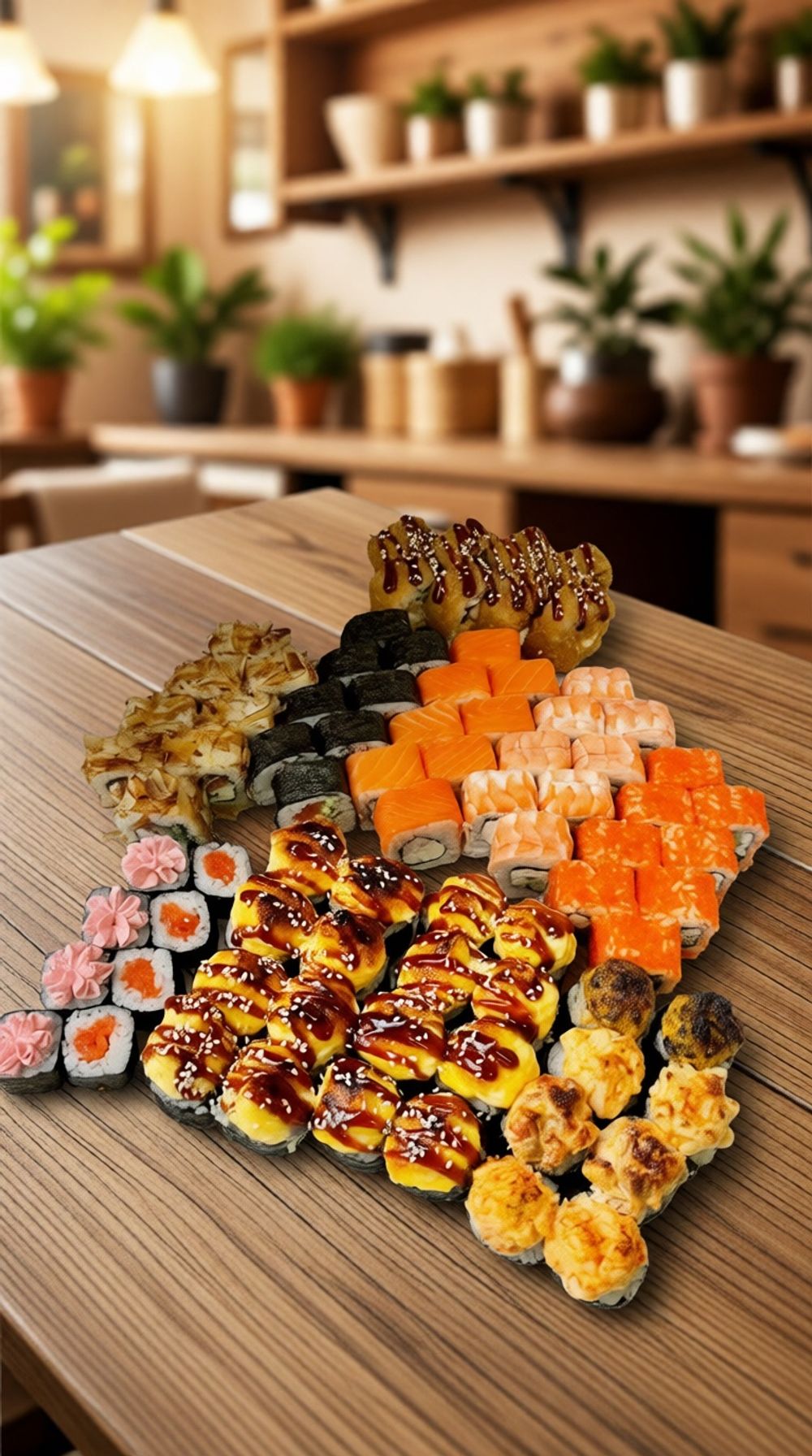 Филадельфия с креветкой,бонито,ролекс,классический с креветкой(4шт.)классический с лососем(4шт.),большой с тунцом,калифорния с лососем,фритюрный с лососем и креветкой,наслаждение с лососем,наслаждение с креветкой,много рыбы